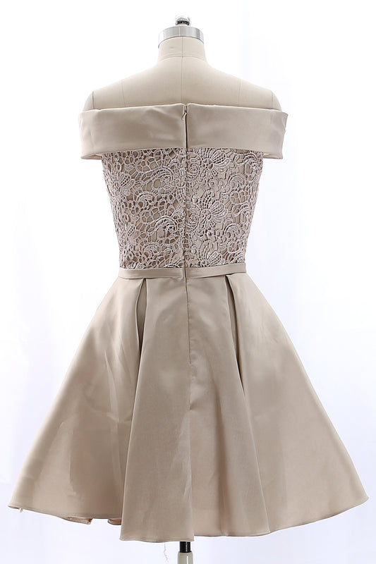 MACloth Off the Shoulder Lace Satin Champagne Mini Prom Homecoming Dress