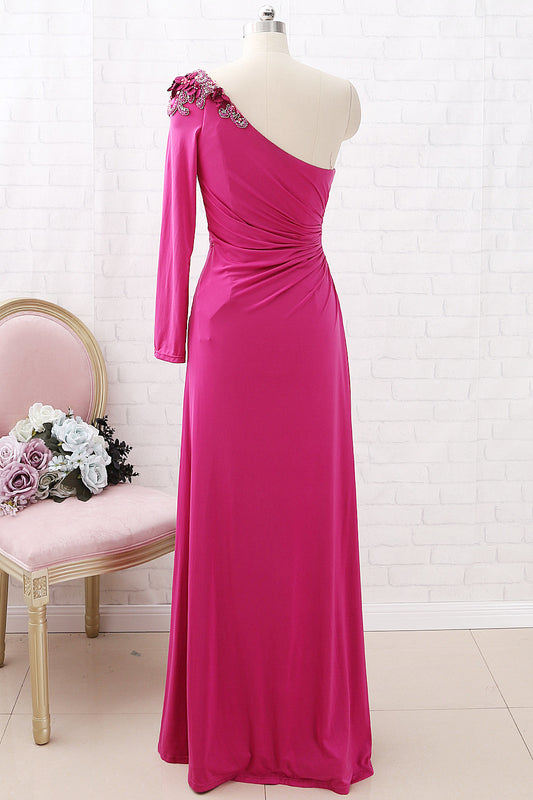 MACloth One Shoulder Long Sleeves Jersey Maxi Prom Dress Fuchsia Formal Evening Gown