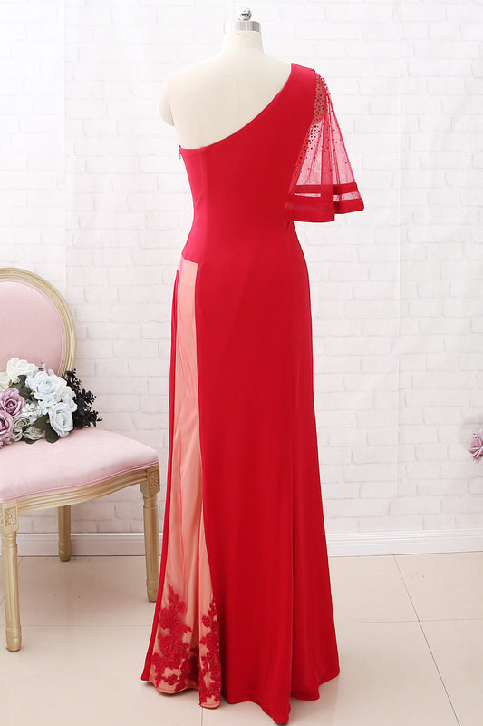 MACloth One Shoulder Sheath Long Jersey Prom Dress Red Formal Evening Gown