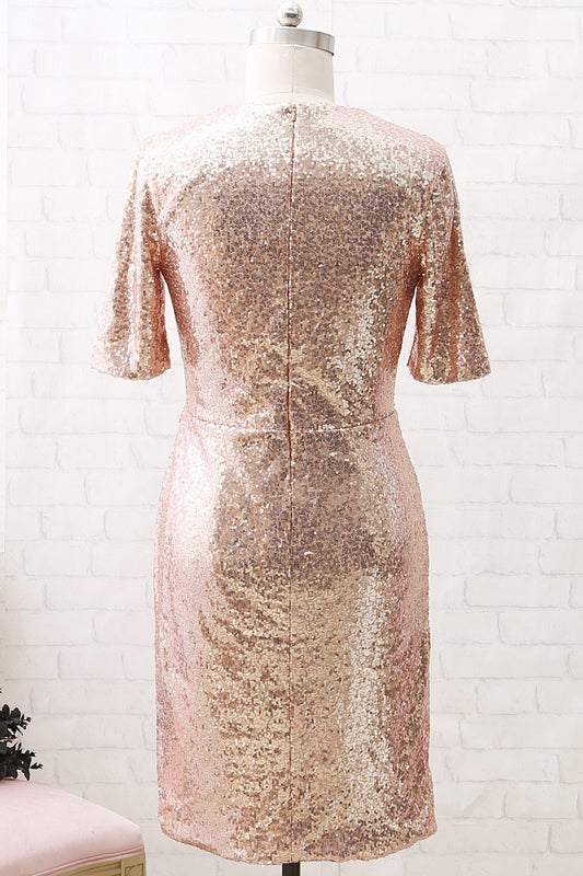 MACloth Short Sleeves V Neck Sequin Short Formal Party Dress Rose Gold Cocktail Dress