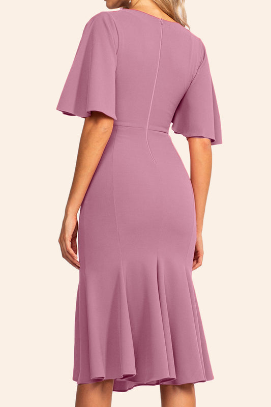 MACloth Short Sleeves Midi Pink Cocktail Dress Jersey Tea Length Formal Party Dress