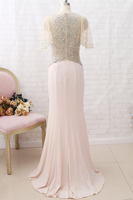 MACloth Short Sleeves with Crystals Sheath Long Prom Dress Jersey Formal Evening Gown