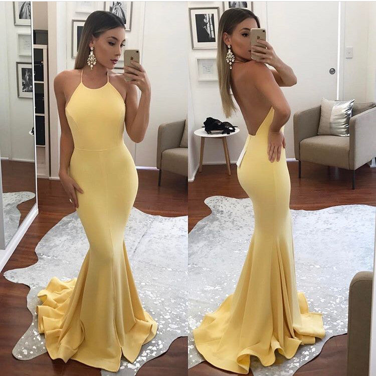 MACloth Meerjungfrau Neckholder Jersey Langes Ballkleid Rosa/Gelb Abendkleid