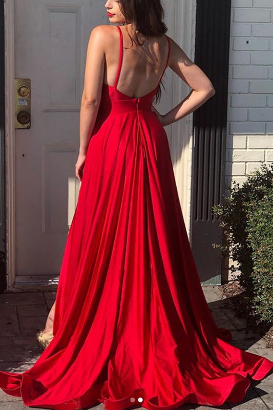 MACloth Träger V-Ausschnitt Satin Langes Ballkleid Rotes formelles Abendkleid