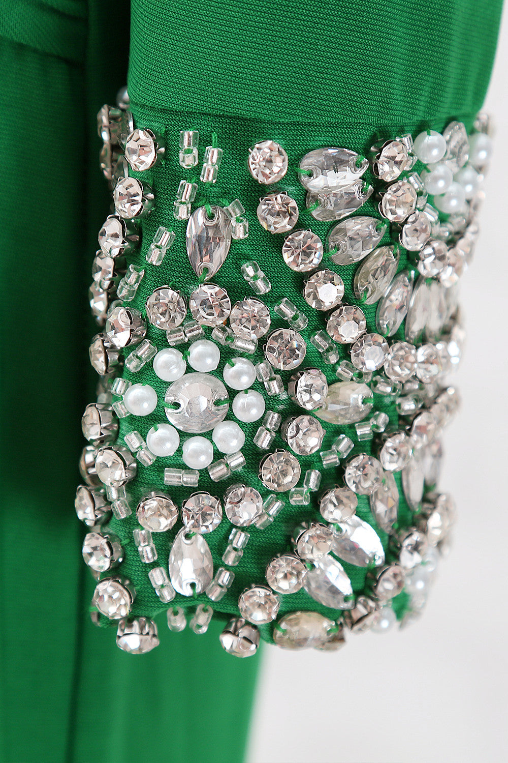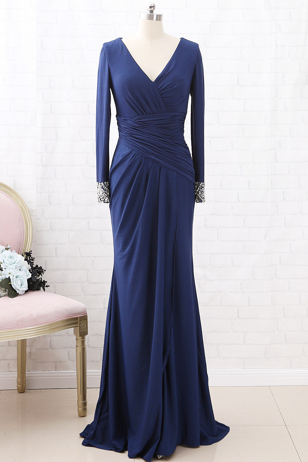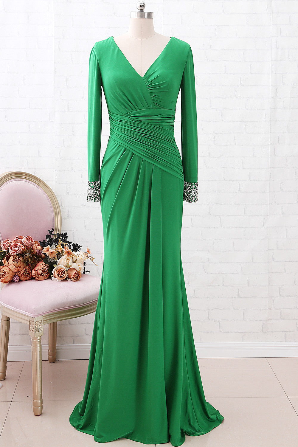 MACloth Lange Ärmel V-Ausschnitt Jersey Langes Kleid für die Mutter der Braut Grünes formelles Abendkleid