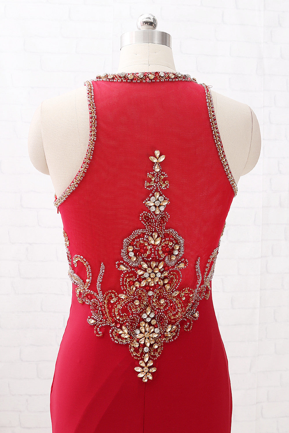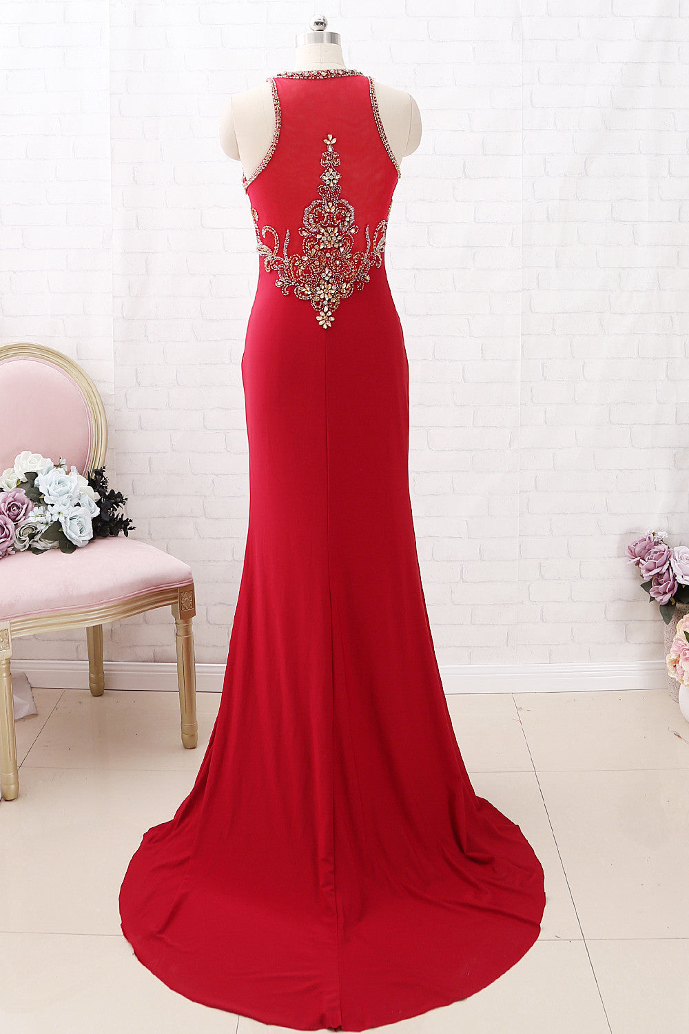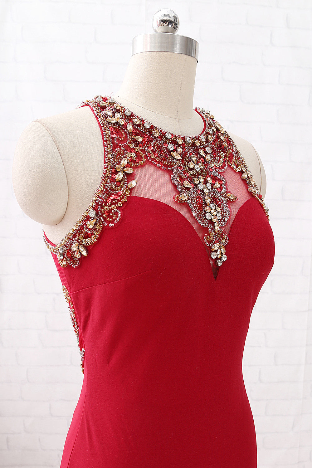 MACloth Träger O-Ausschnitt mit Perlen besetztem Jersey-Ballkleid Burgunderrotes formelles Abendkleid mit Schlitz
