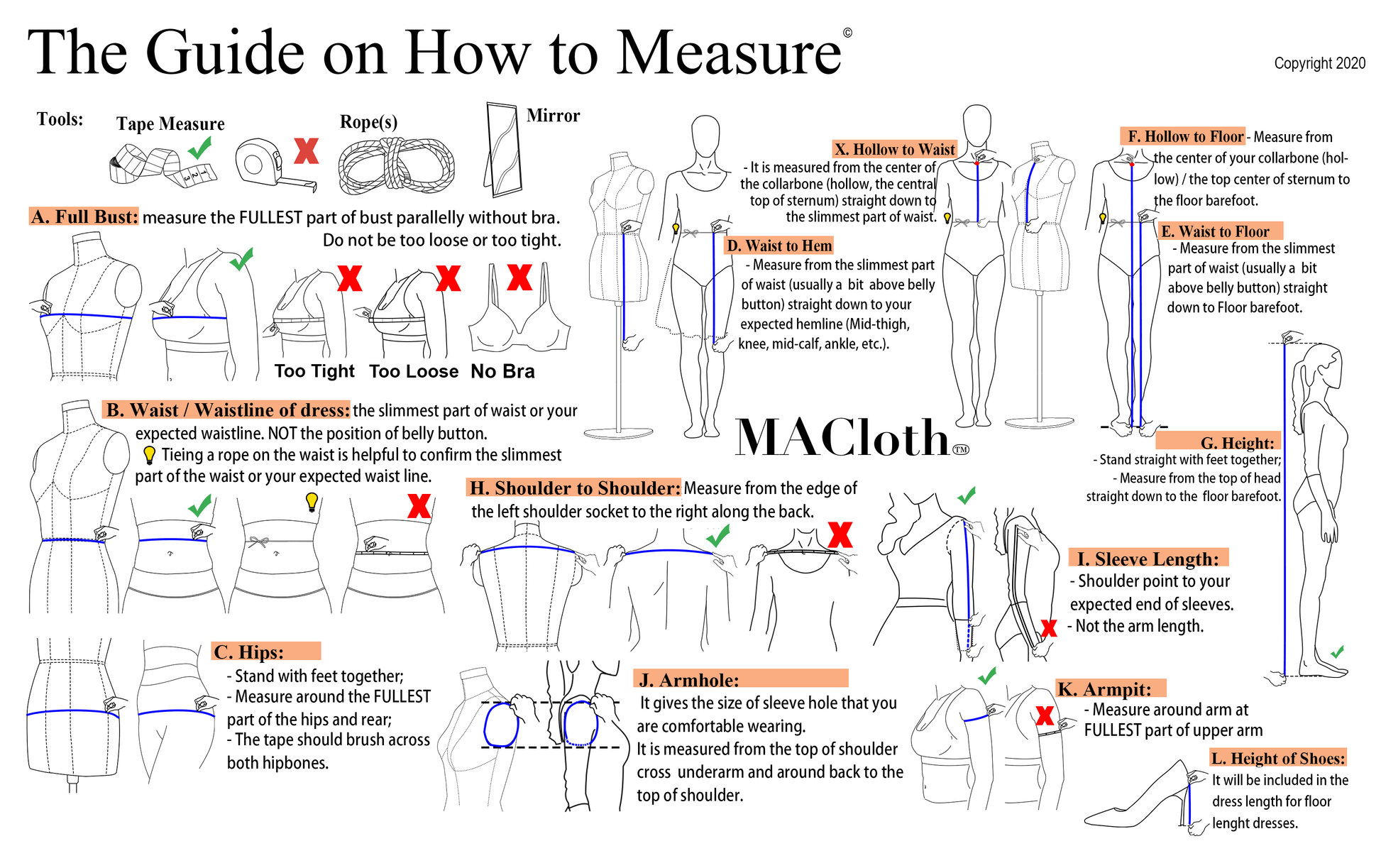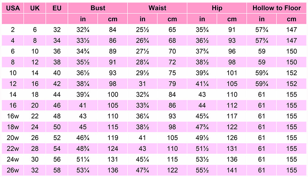 Unsere Kleidung kann größer oder kleiner ausfallen als die Größe, die Sie normalerweise tragen. Die Größentabellen unten zeigen die Maße für alle unsere Standardkleidungsstücke. Vergleichen Sie Ihre Maße unbedingt mit diesen Tabellen, um sicherzustellen, dass Ihr maßgeschneidertes Kleid passt!