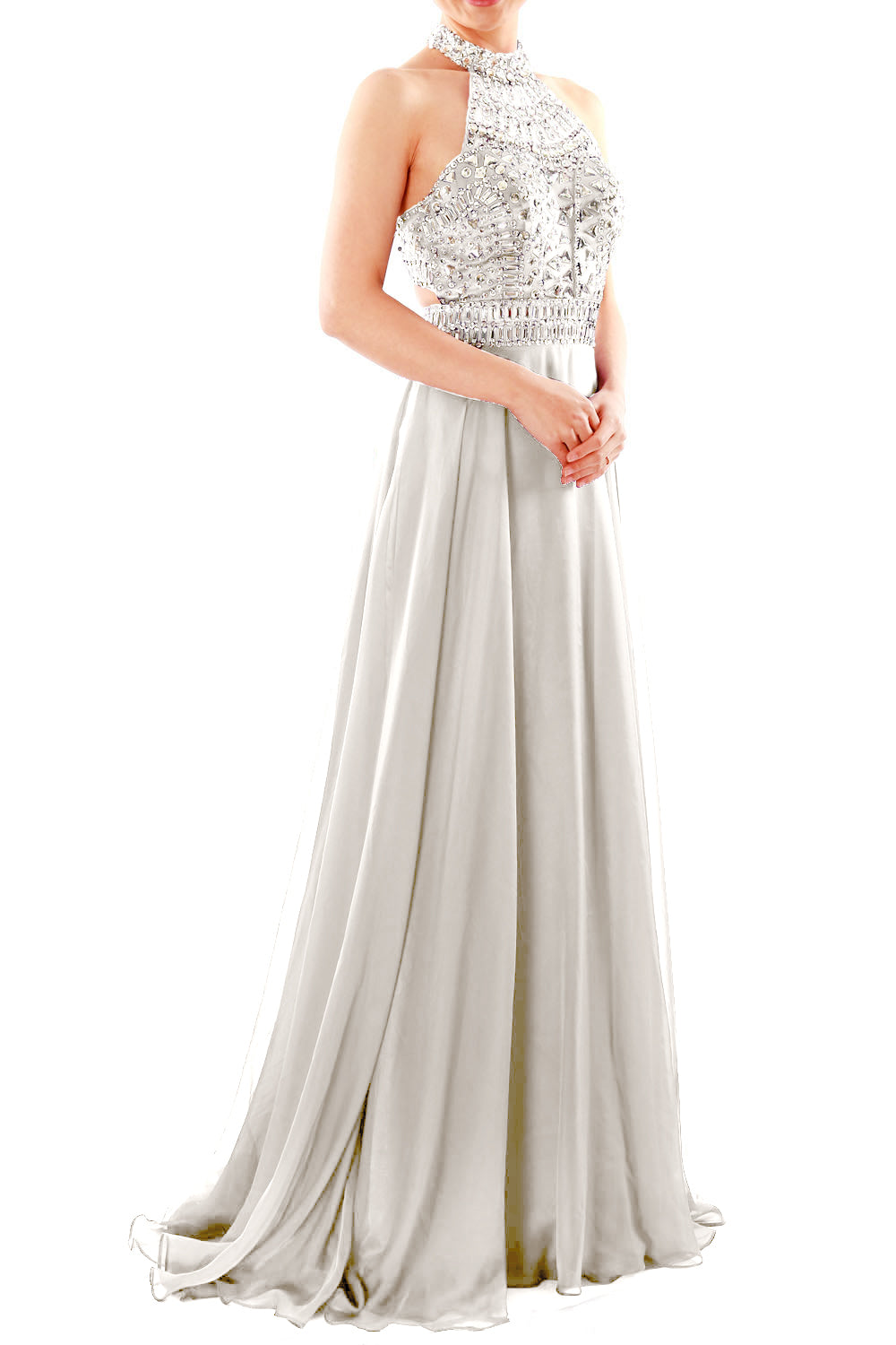 Dieses hochgeschlossene Neckholder-Oberteil ist rundum mit zarten, funkelnden Kristallperlen verziert. Der lange, weiche Chiffonrock in Bodenlänge ist an der Taille mit passenden Kristallperlen verziert.