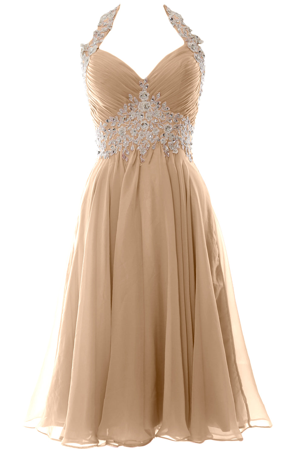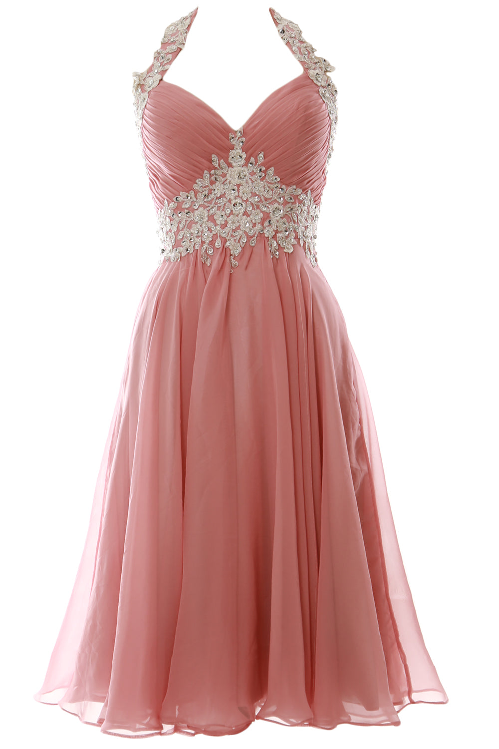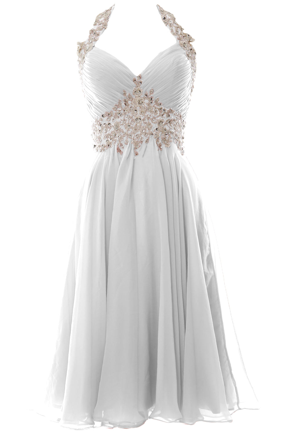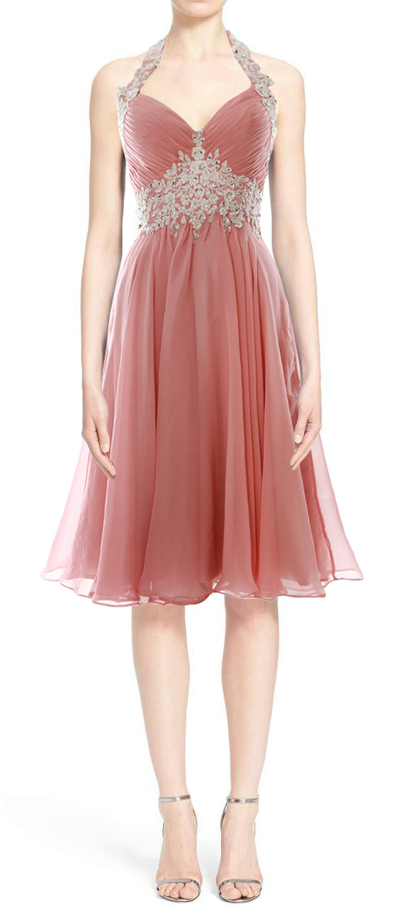 Die reich mit Perlen besetzte Empire-Taille und der Neckholder verleihen viel Glanz und sorgen für eine schmeichelhafte Silhouette. Das gerüschte Mieder und der fließende Stoff sitzen an den richtigen Stellen. Der knielange Chiffonrock verleiht diesem ohnehin schon fabelhaften Ensemble ein fließendes Gefühl und einen Hauch von Dramatik.