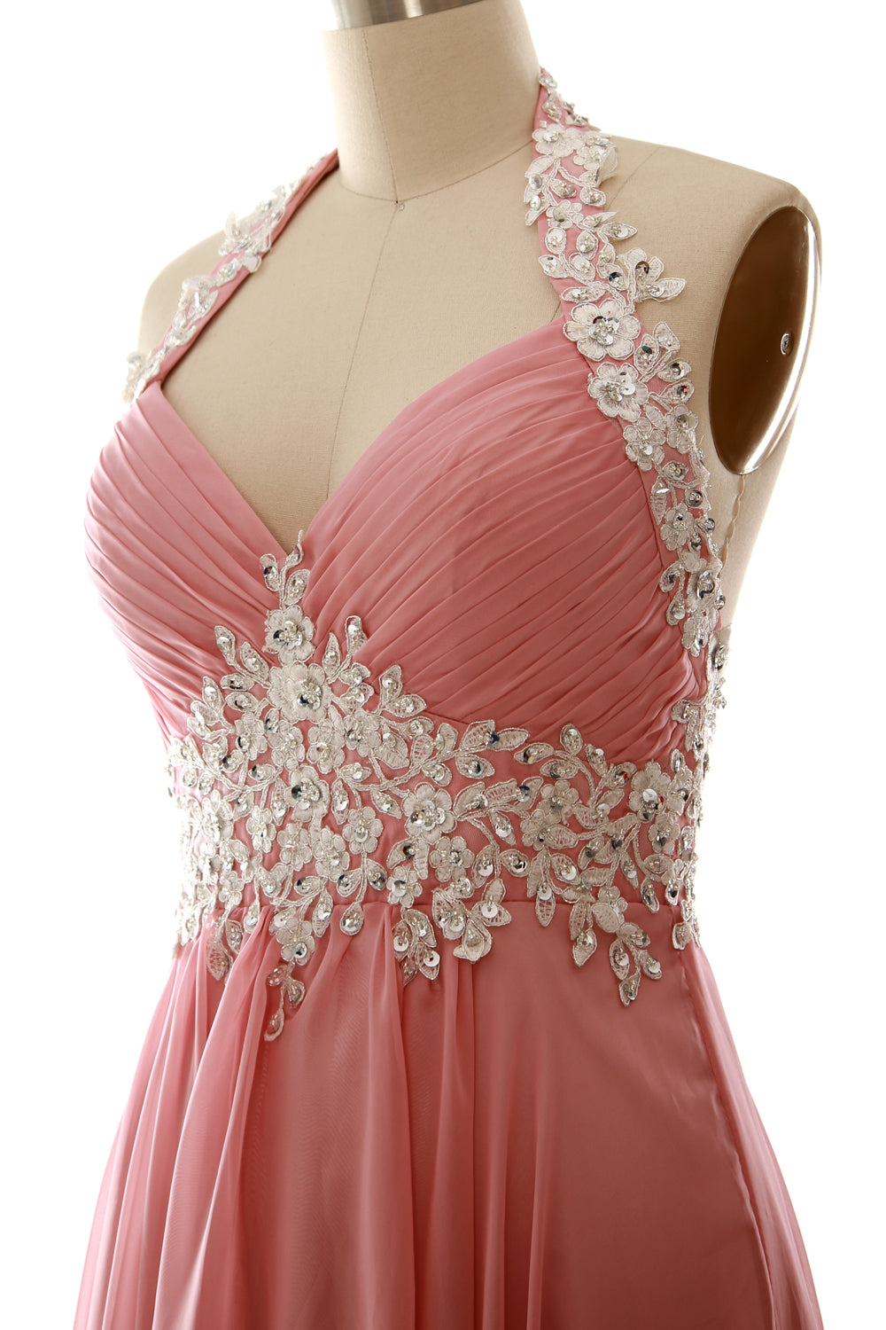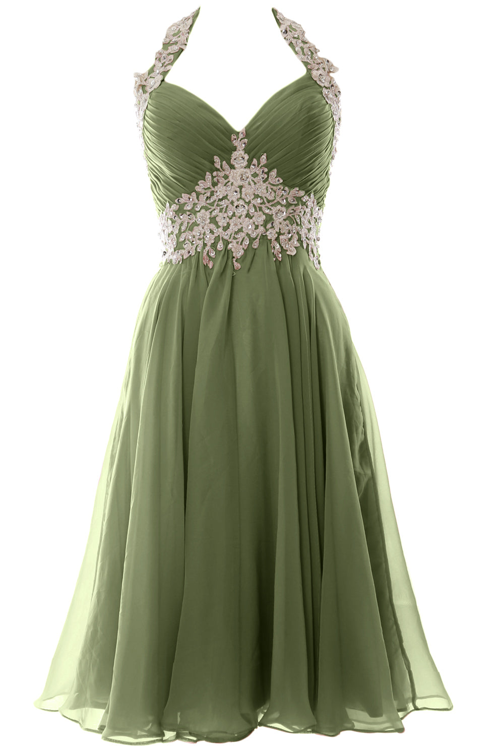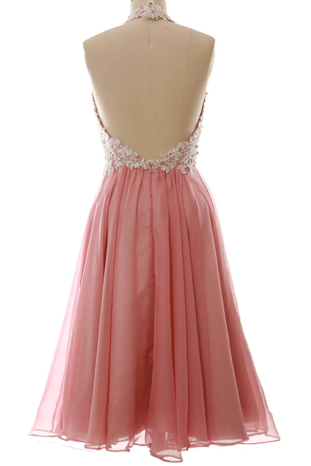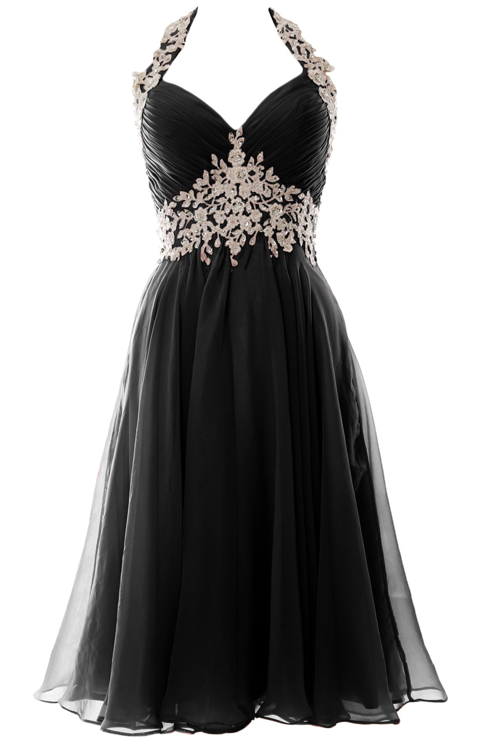 Die reich mit Perlen besetzte Empire-Taille und der Neckholder verleihen viel Glanz und sorgen für eine schmeichelhafte Silhouette. Das gerüschte Mieder und der fließende Stoff sitzen an den richtigen Stellen. Der knielange Chiffonrock verleiht diesem ohnehin schon fabelhaften Ensemble ein fließendes Gefühl und einen Hauch von Dramatik.