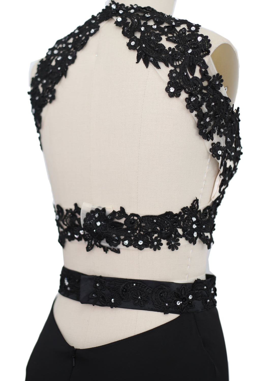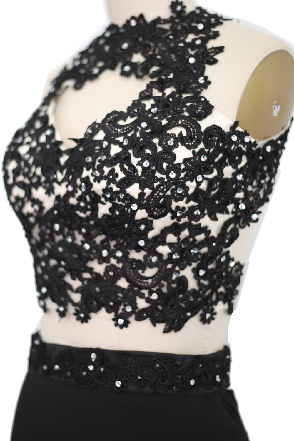 Eine Applikation aus herrlicher Spitze über einem hautfarbenen herzförmigen Futter bildet das bauchfreie Oberteil. Passende Applikationen um die Taille und Übergang zu einem vollen, schmalen Rock mit bequemem Jersey.