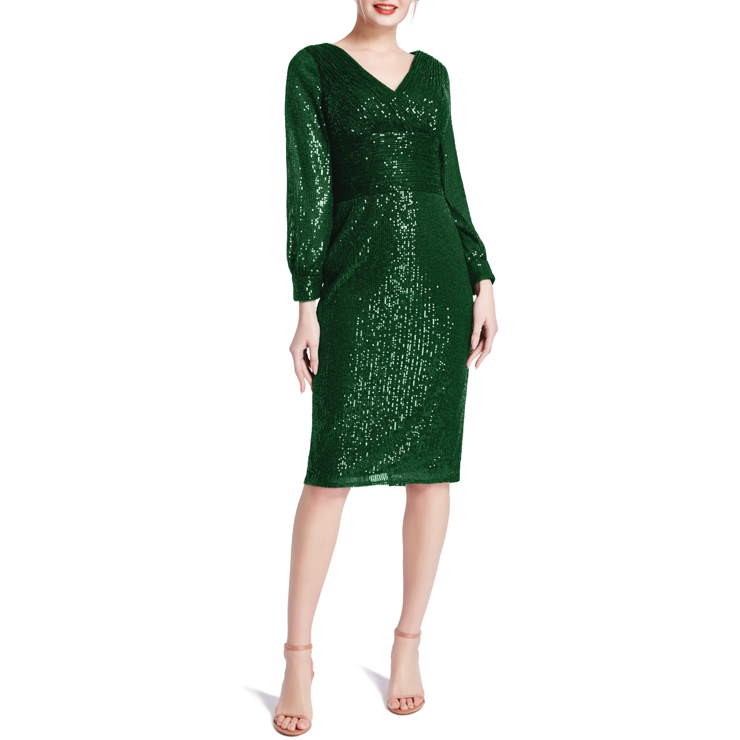 MACloth Damen Empire-Kleid mit V-Ausschnitt, langen Ärmeln und Pailletten, kurz, Cocktailparty-Kleid