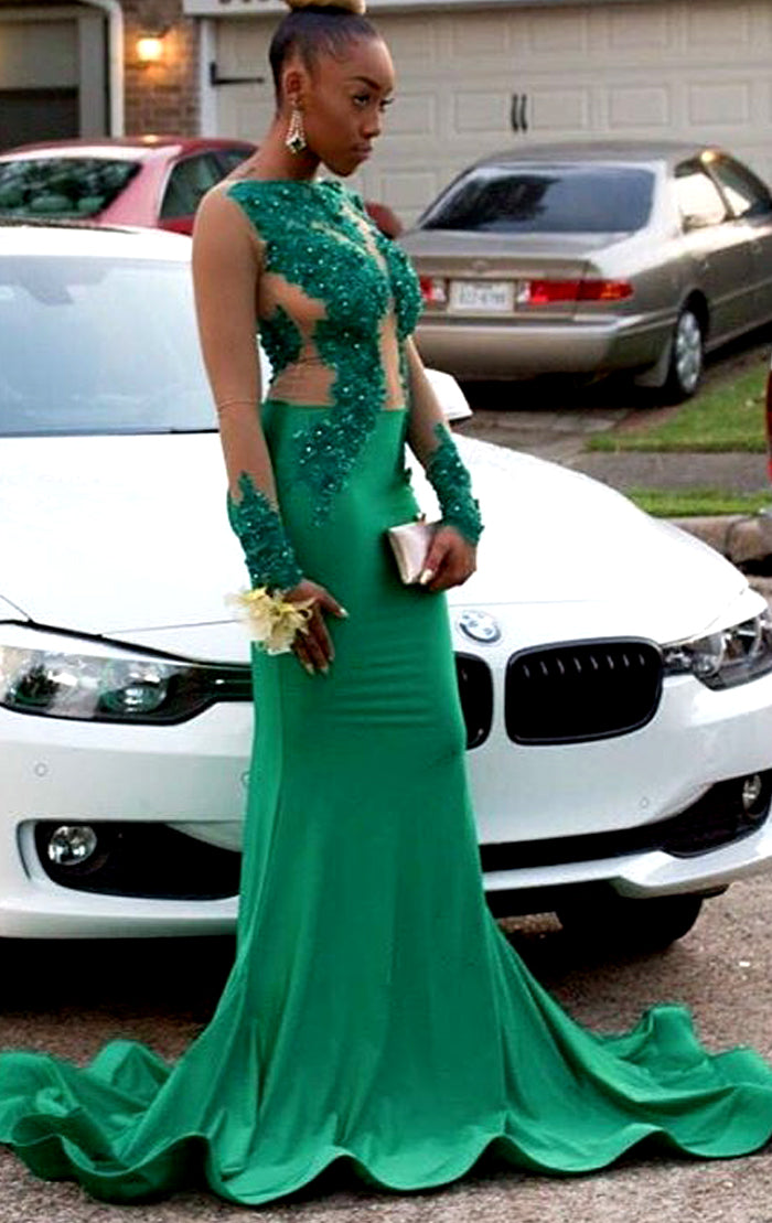 MACloth Meerjungfrau Lange Ärmel Spitze Satin Ballkleid Grün Formales Abendkleid