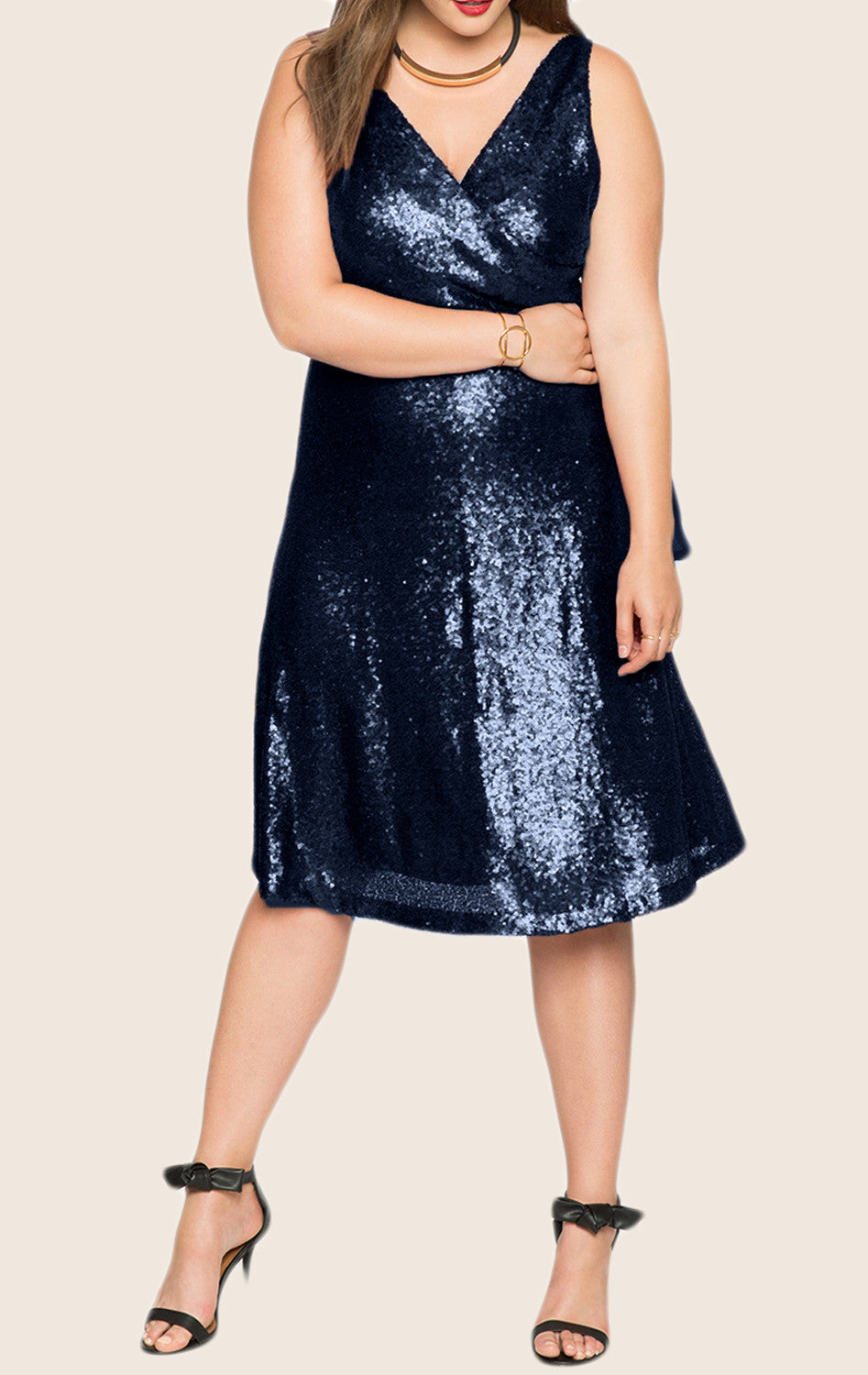 MACloth Träger V-Ausschnitt Pailletten Midi Cocktailkleid Übergröße Dunkelmarine Abendkleid