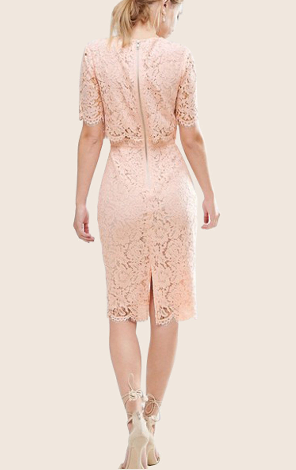 MACloth Zweiteiliges rosa Cocktailkleid aus Spitze mit kurzen Ärmeln, Midi-Abendkleid