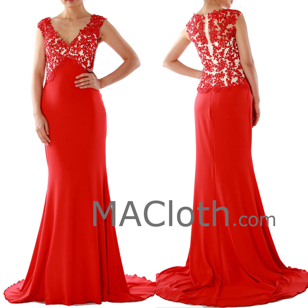 Meerjungfrau-Träger, V-Ausschnitt, Spitzenjersey, rotes Abendkleid 160134