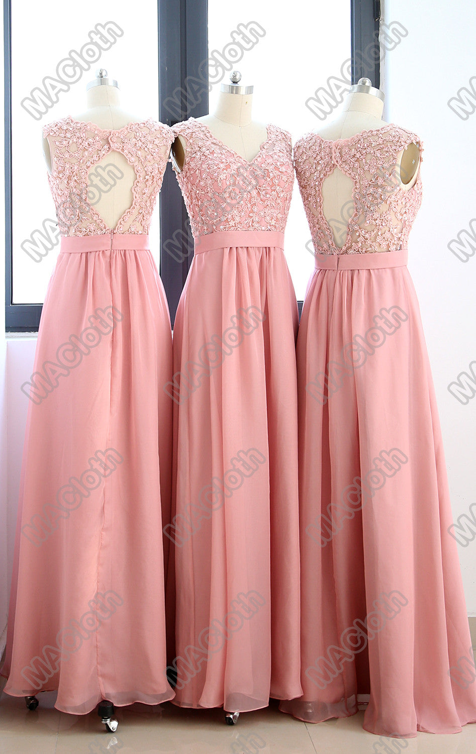 MACloth Träger V-Ausschnitt Spitze Chiffon Langes Ballkleid mit offenem Rücken Zartrosa Abendkleid