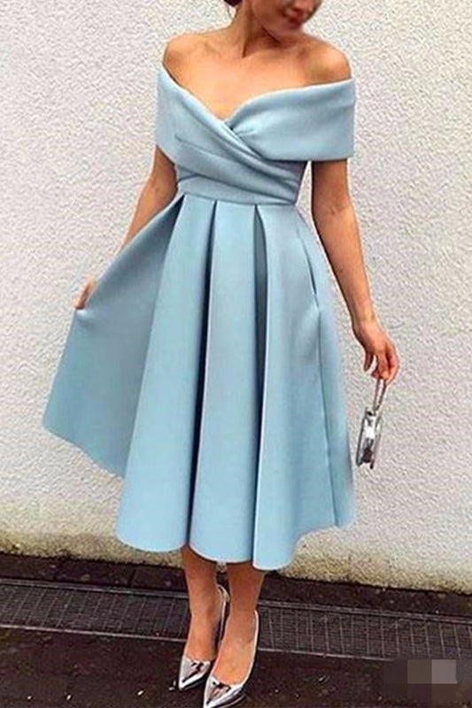 MACloth Off the Shoulder Satin Midi Cocktail Dress Sky Blue Tea Length Formal Dress