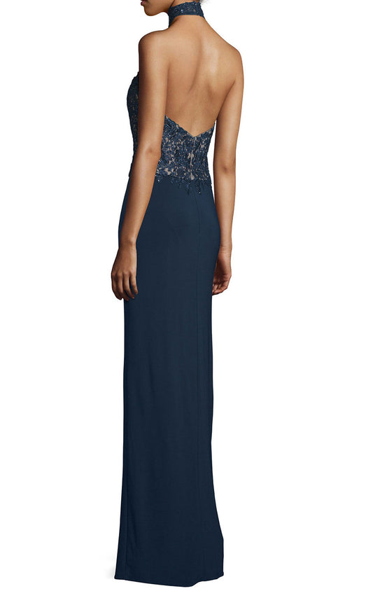 MACloth Women Halter Lace Jersey Long Evening Gown Sleeveless Formal Dress