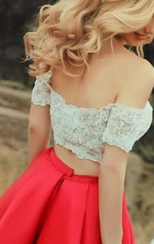 MACloth Two Piece Off the Shoulder Short Prom Homecoming Dress Red Lace Satin Wedding Party Dress