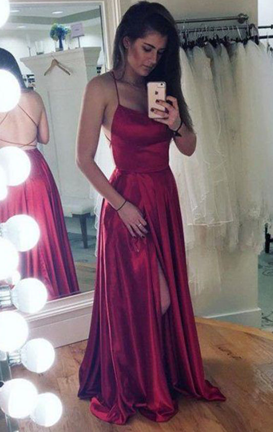 MACloth Spaghetti Straps Satin Chiffon Long Prom Dress Red Formal Evening Gown