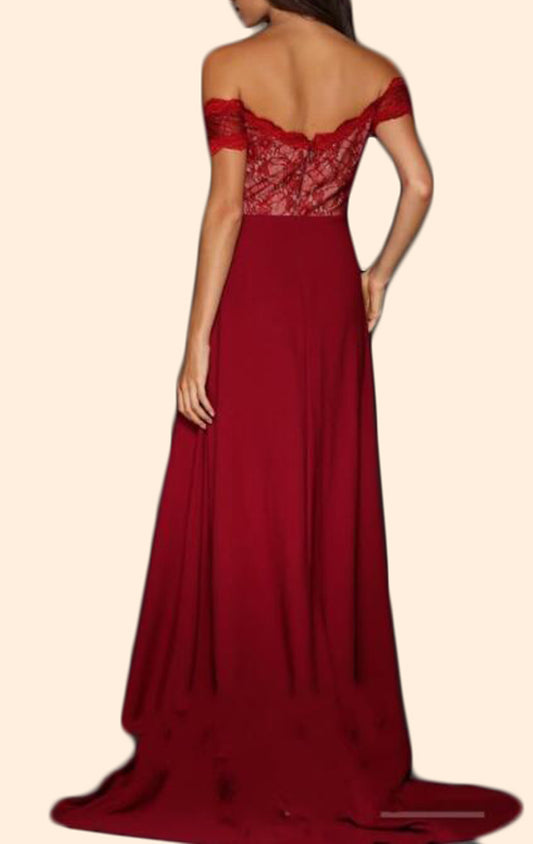 MACloth Off the Shoulder Lace Chiffon Long Prom Dress Burgundy Formal Gown