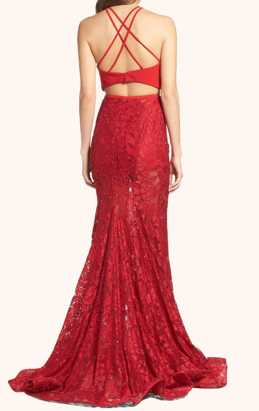 MACloth Two Piece Lace Long Prom Dress Red Formal Evening Gown