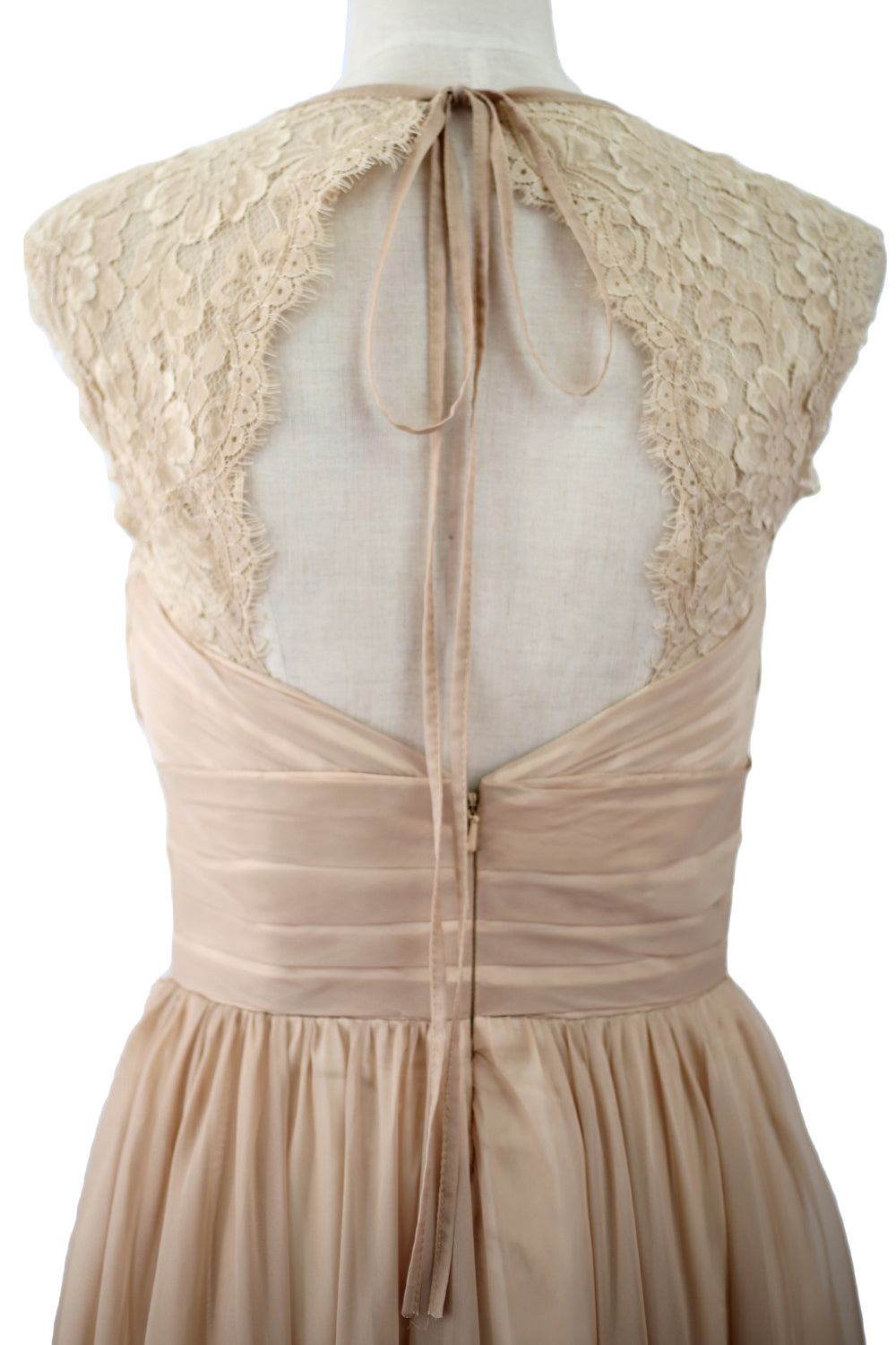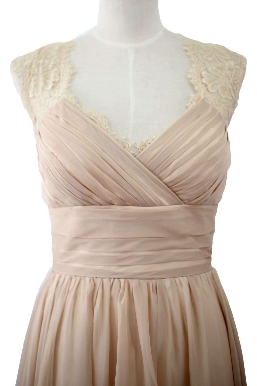 This gown showcases a modified v-neckline with lace cap sleeves. A pleated sweetheart bodice with waistband creates a lovely look. The full length skirt wonderfully flows down to the floor as you gracefully walk around.