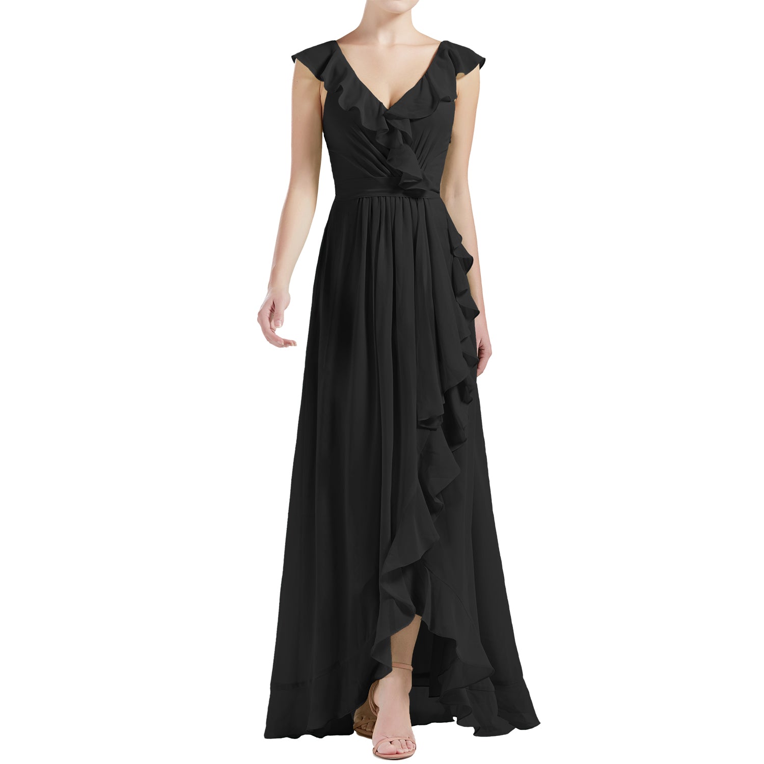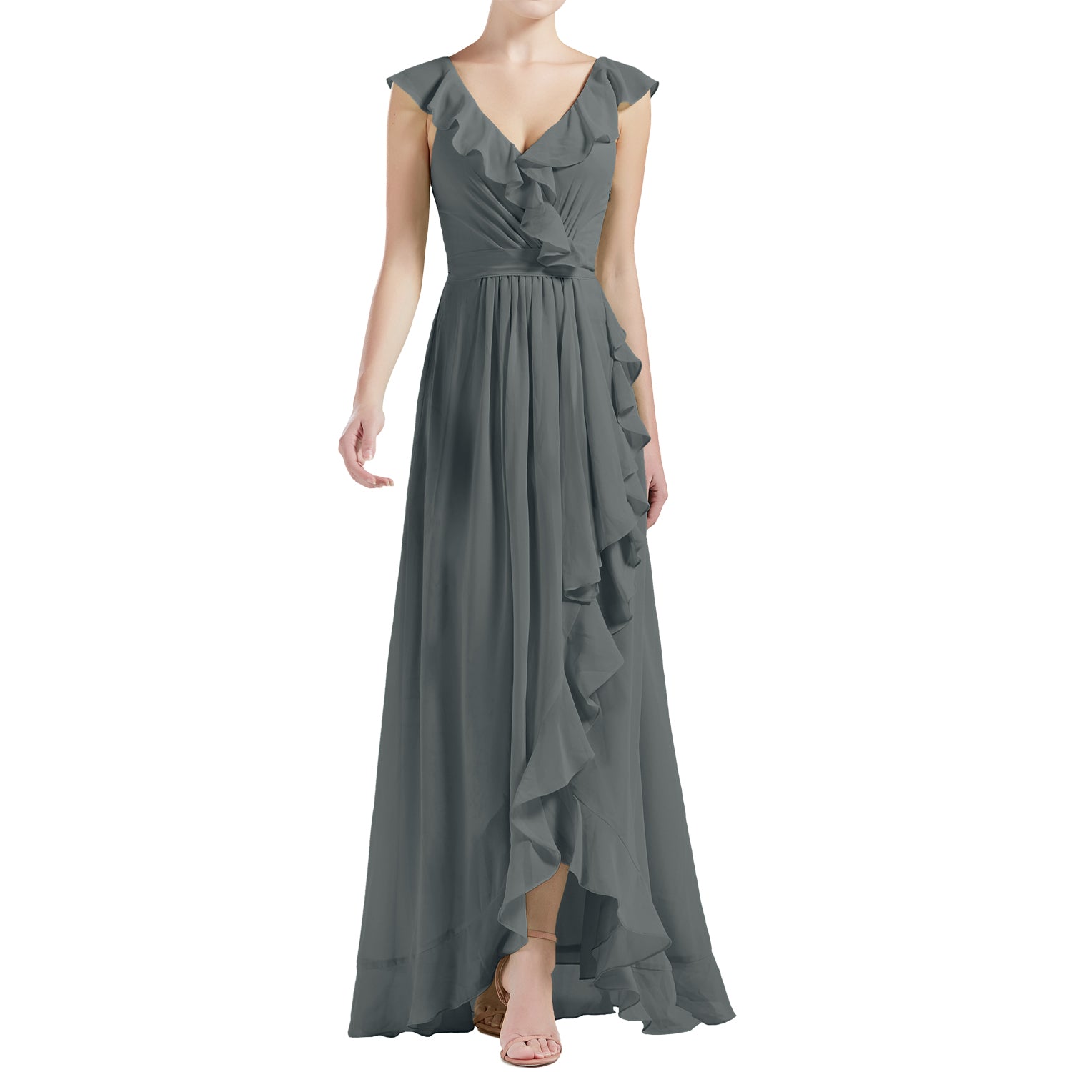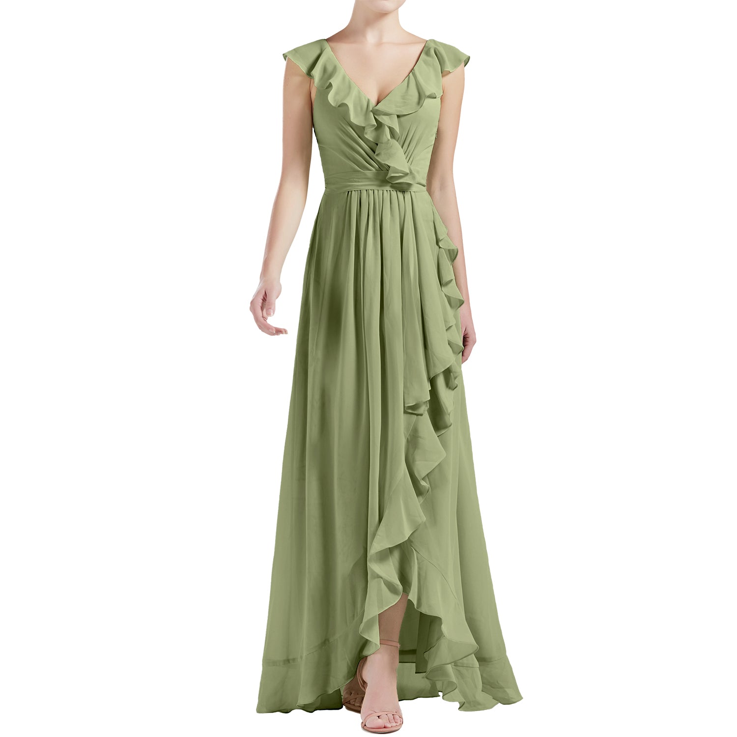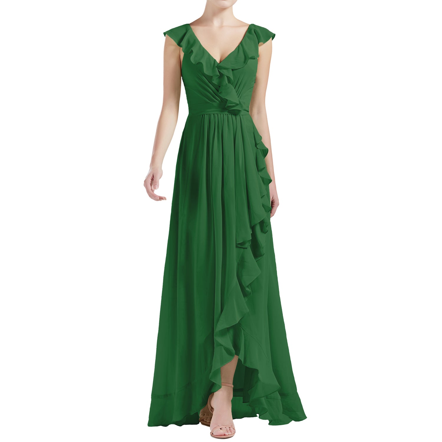 MACloth Women V Neck Ruffle Cap Sleeve Hi-Lo Long Wedding Bridesmaid Dresses