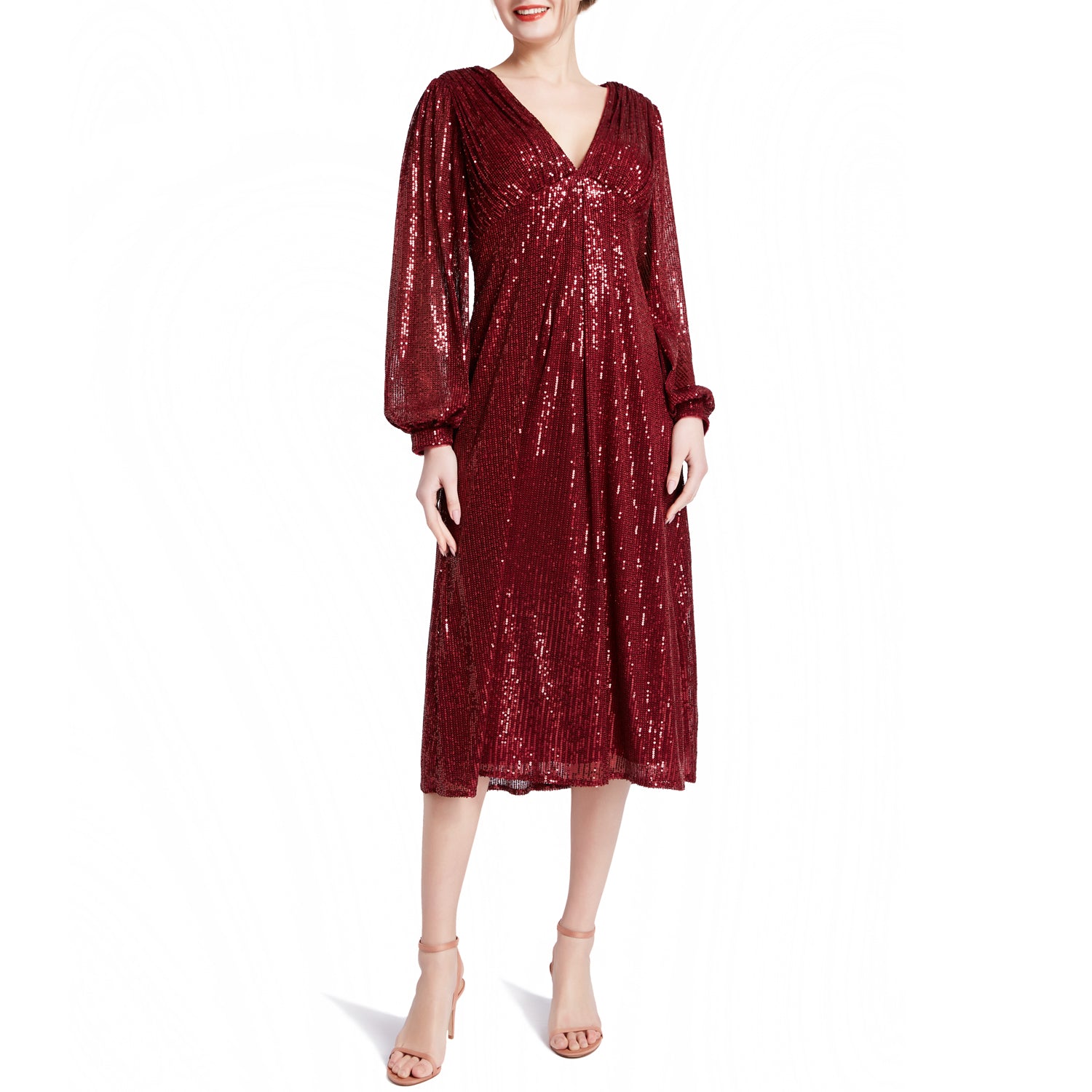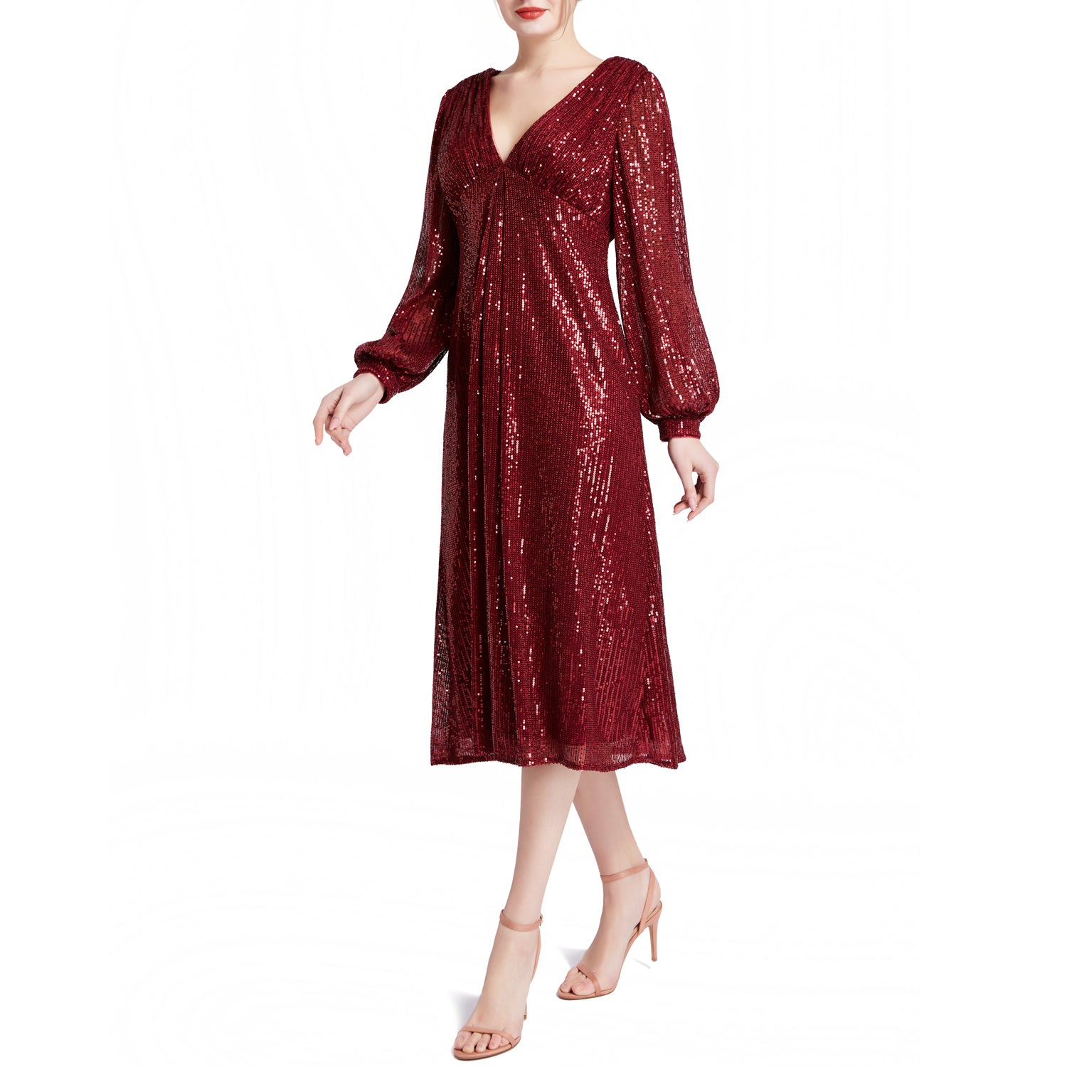 MACloth Women Tea Length Long Puff Sleeve Empire Sequin Cocktail Party Dresses