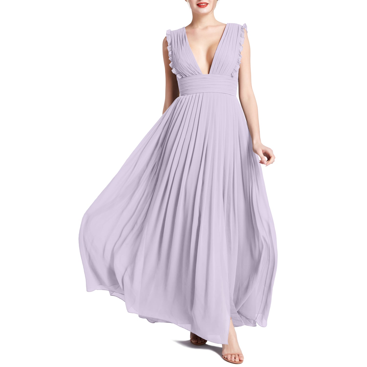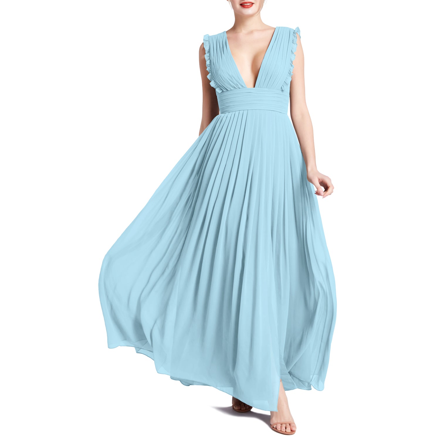 MACloth Women V Neck Ruffle Long Pleated Wedding Party Bridesmaid Dresses