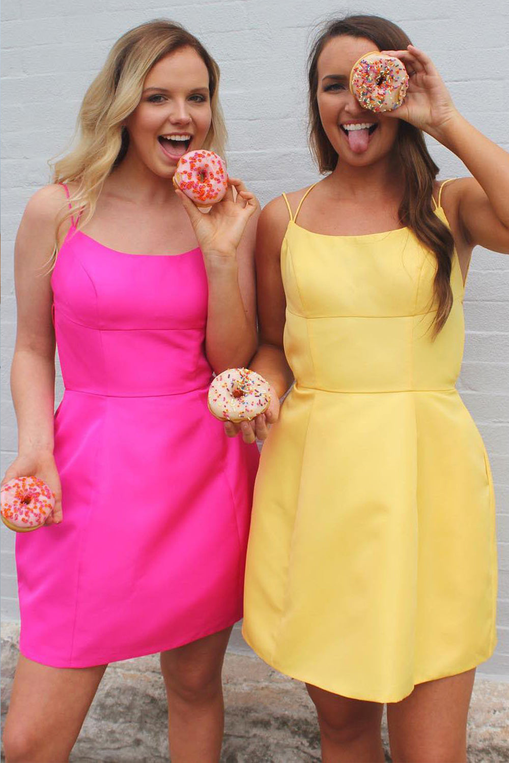 Vestido corto de fiesta de cóctel amarillo con escote redondo y tirantes finos de MACloth