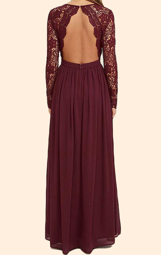 Vestido de fiesta largo de gasa con encaje y escote en V y mangas largas de MACloth, vestido formal de noche color burdeos