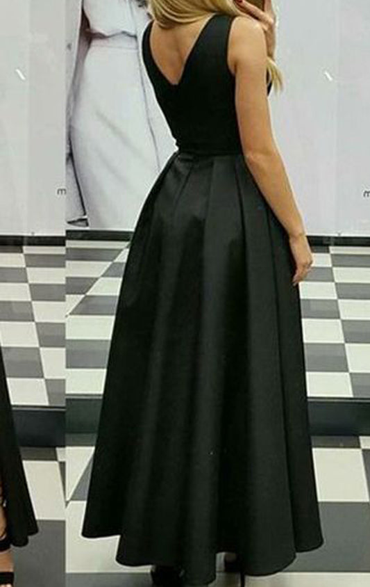 Vestido de fiesta de graduación con escote en V profundo y bajo de MACloth, vestido de noche formal de satén negro