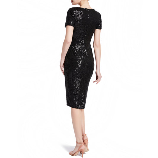 MACloth Vestidos de cóctel casuales con lentejuelas, hasta la rodilla, con cuello en V y mangas cortas para mujer