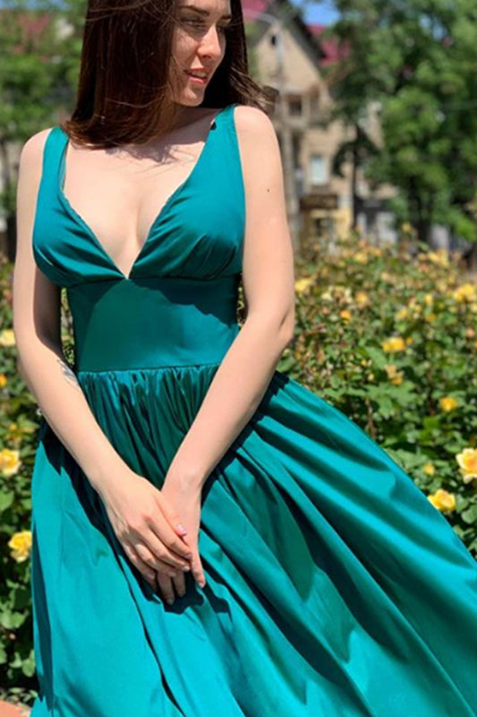 Vestido de fiesta largo de satén con escote en V y tirantes MACloth en color verde azulado