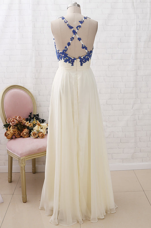 Vestido de fiesta largo de gasa con escote en V y tirantes MACloth, de encaje, color azul real y marfil, vestido de noche formal