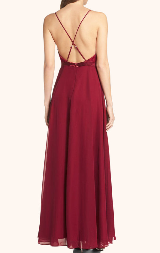 Vestido de fiesta largo de gasa con escote en V y tirantes MACloth, vestido formal color burdeos