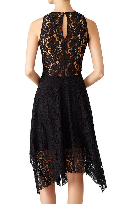 Vestido de cóctel formal de encaje alto-bajo con tirantes MACloth y escote redondo, vestido negro corto