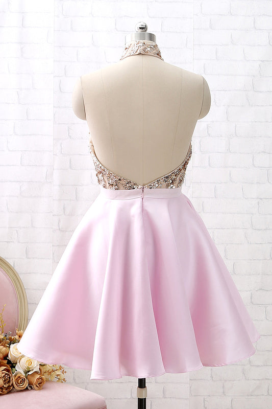 Vestido corto de fiesta de cóctel rosa con cuello halter y lentejuelas de MACloth