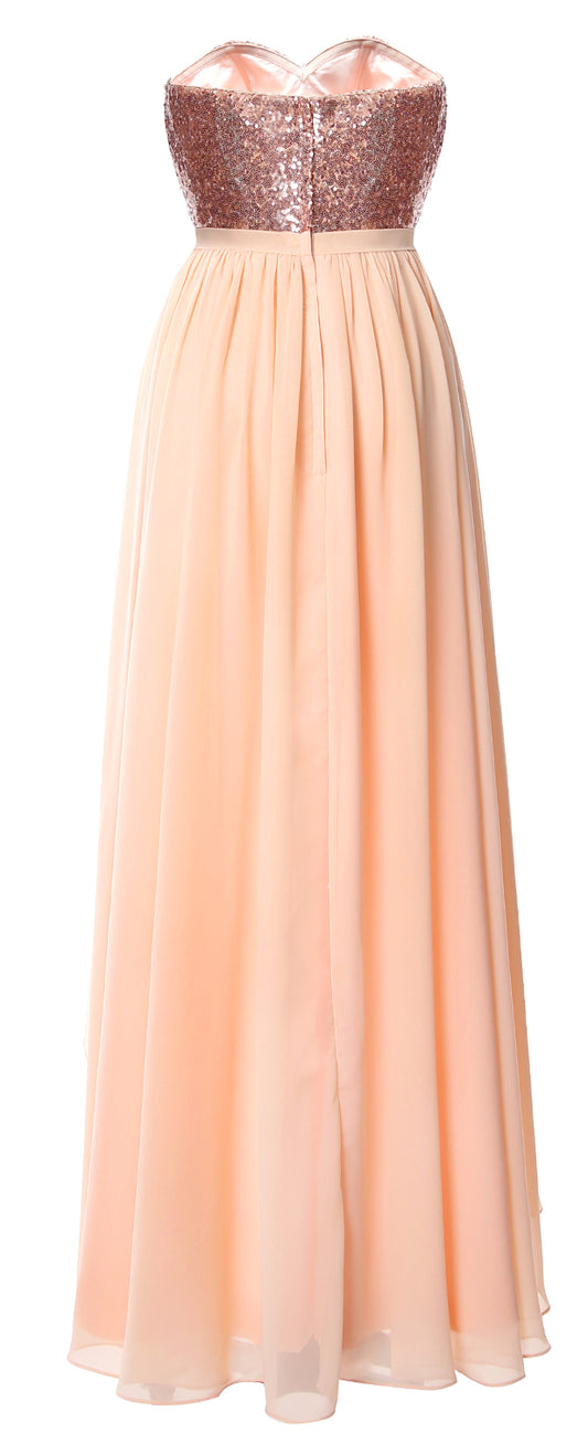 Vestido formal sencillo de fiesta con escote alto y lentejuelas en color oro rosa de MACloth con abertura