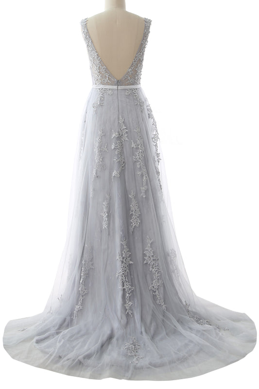 Vestido de fiesta largo de satén con escote en V y ilusión MACloth en color azul cielo