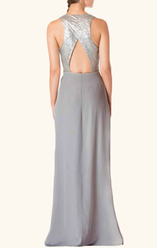 Vestido de dama de honor largo de gasa con escote en V y tirantes MACloth, con lentejuelas, vestido formal plateado