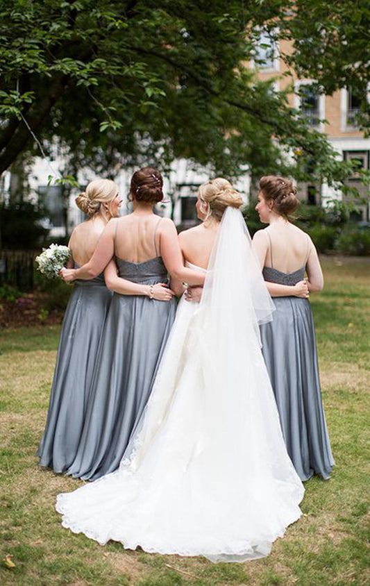 Vestido largo de gasa con encaje y cuello halter de MACloth para dama de honor, vestido formal vintage gris para fiesta de boda