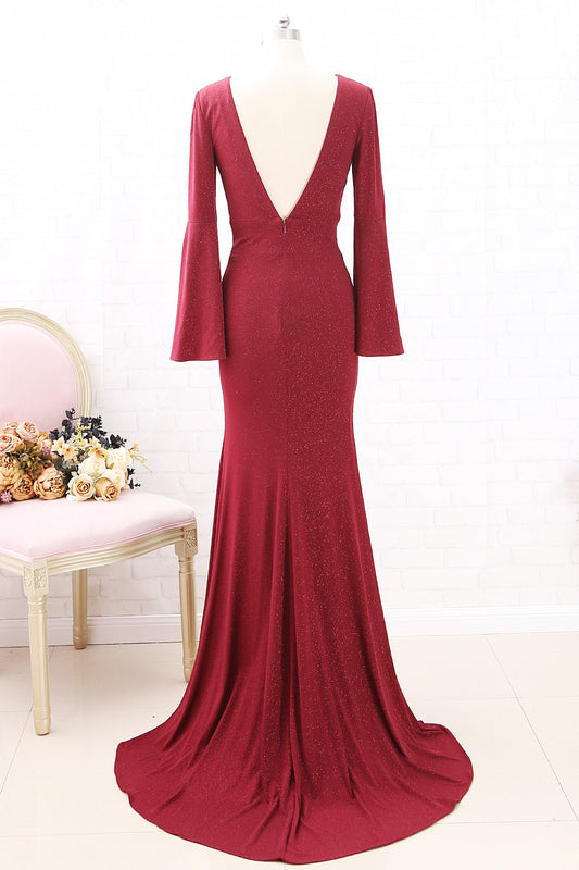 Vestido de noche formal color burdeos con escote en V y mangas largas estilo sirena de MACloth