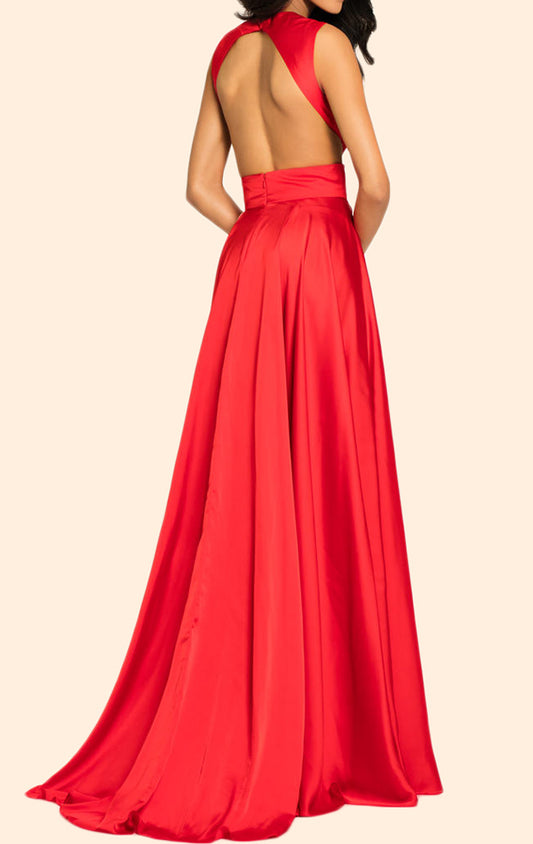 Vestido de fiesta largo de gasa satinada con cuello redondo de MACloth, vestido de noche formal rojo