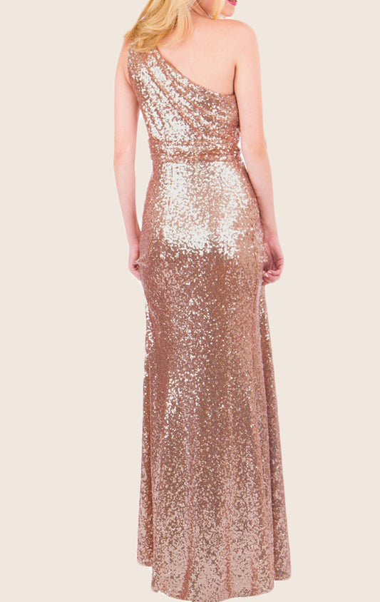 Vestido de dama de honor largo con lentejuelas y un hombro de MACloth, vestido formal en oro rosa