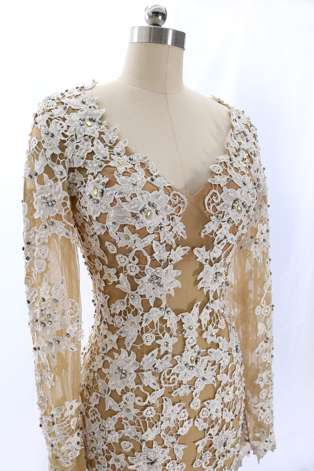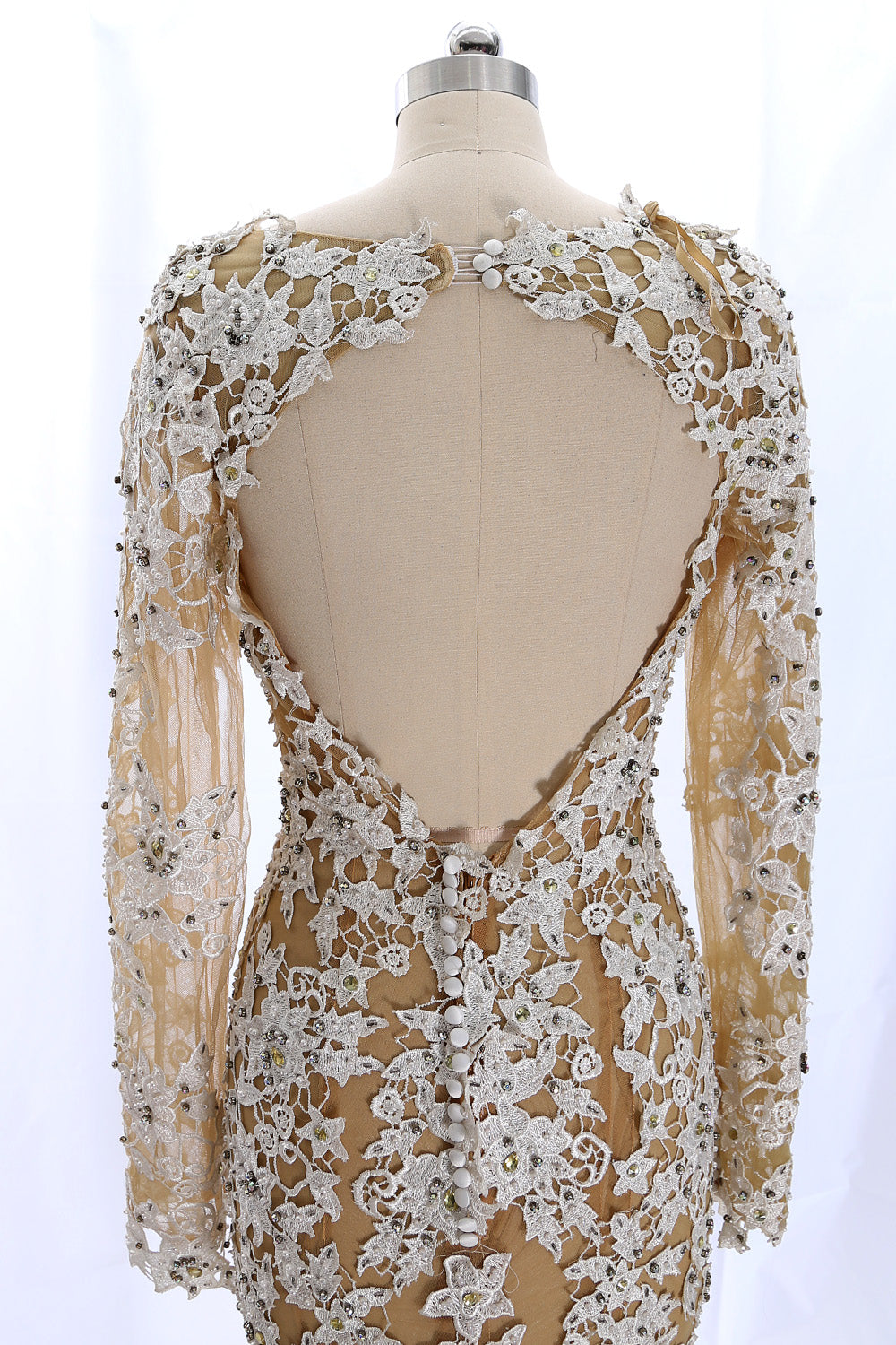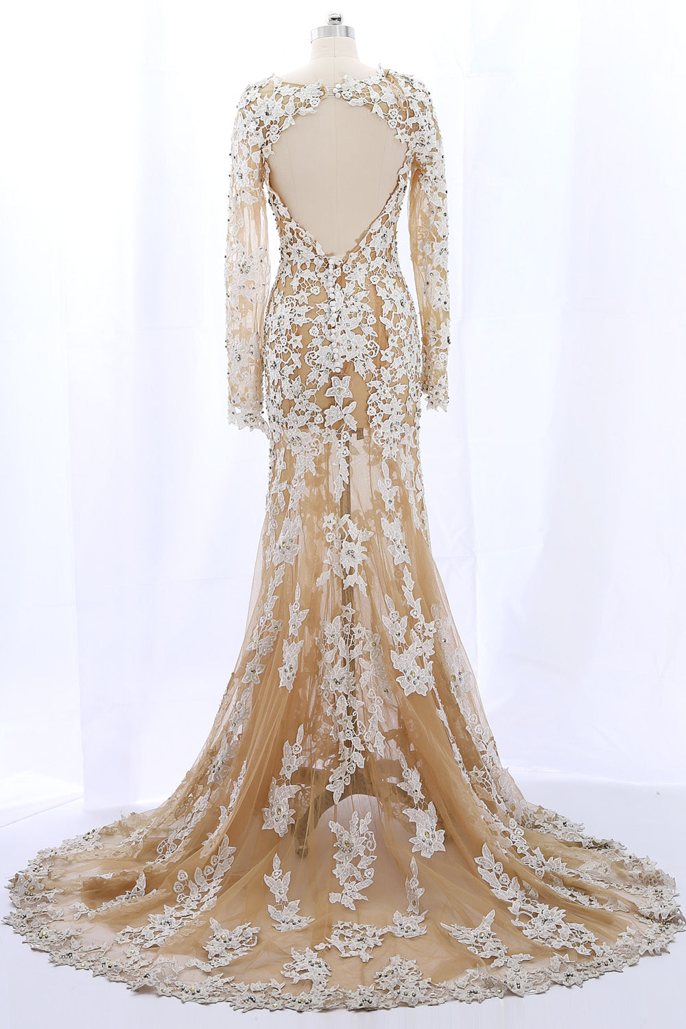 Vestido de noche formal de sirena con encaje y mangas largas de MACloth color champán