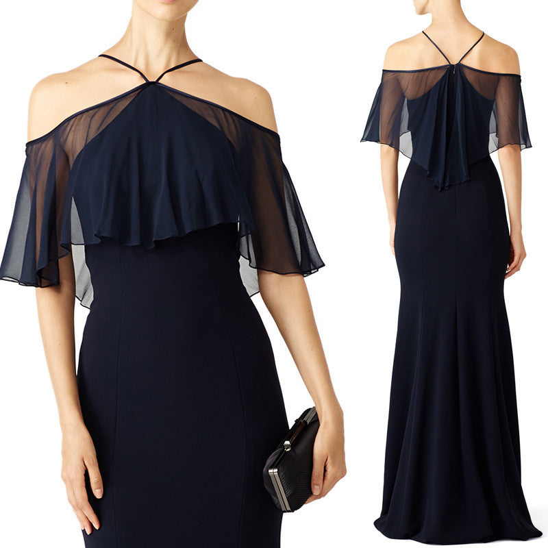 Vestido de noche de jersey de gasa con volantes y hombros descubiertos de MACloth, vestido de fiesta sencillo en azul marino oscuro