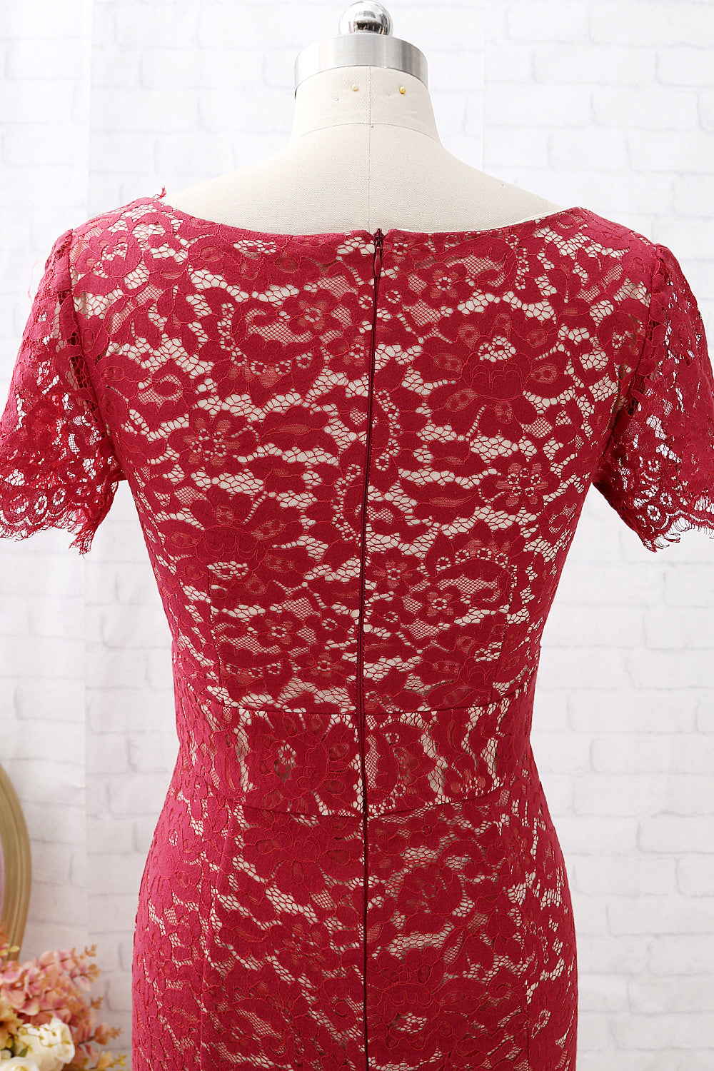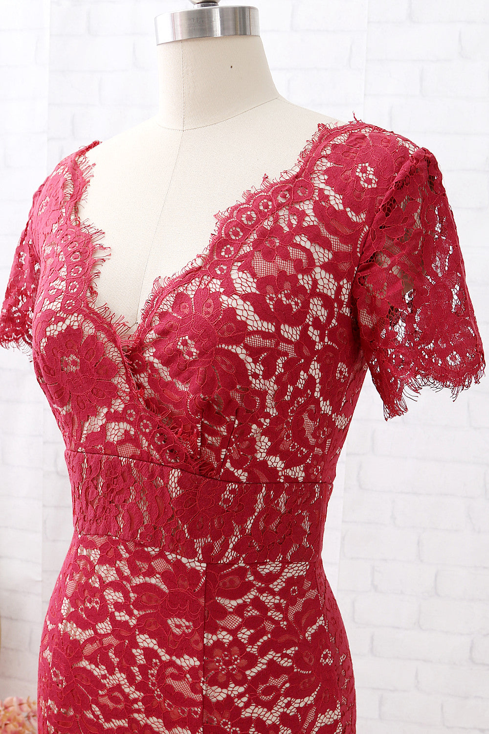 Vestido de noche formal de encaje color burdeos con escote en V y mangas cortas de MACloth